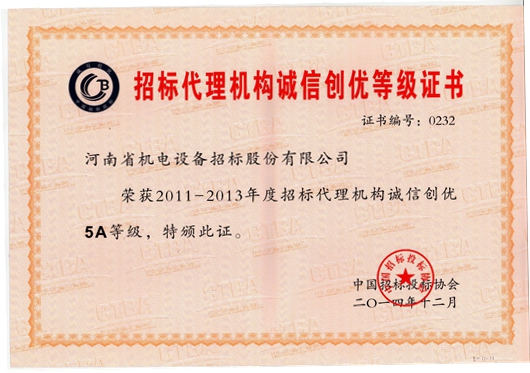 近年来,我公司通过不断完善自身建设,规范管理,严格遵守各项法律规定,在河南招投标市场上树立了良好的口碑,得到了采购人和投标人的一致好评。2014年获得了中国招标投标协会“诚信创优5A等级”桂冠。